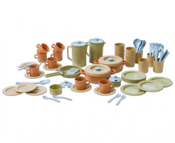 Mit diesem umfangreichen Geschirrset für die Kinderküche werden Rollenspiele wunderbar real. Die 79 Teile sind aus 100% nachhaltigem Biokunststoff hergestellt – das macht nicht nur Spaß, sondern schont auch die Umwelt! Für die Herstellung wird auf Zuckerrohr zurückgegriffen. Dieser nachwachsende Rohstoff bindet CO2 und wirkt dem Treibhauseffekt entgegen.