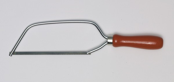 Ausladung 45mm, Stiftsägeblätter, 148 mm Stiftabstand. Aus Rundstahl 6mm, vernickelt mit Buchenholzheft. Lieferung inkl. 1 Metallsägeblatt.