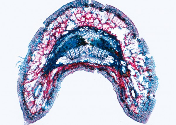 Querschnitte durch gesunde und umweltgeschädigte Blätter zum Vergleich