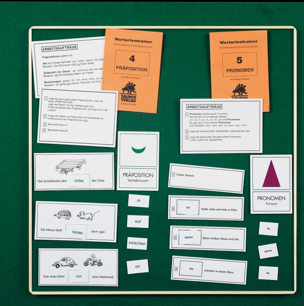 Auch hier verwenden wir Karten (A7) für die Wortarttermini ARTIKEL / NOMEN / ADJEKTIV / VERB / PRäPOSITION / PRONOMEN mit den farbigen Symbolen aus der Montessori-Pädagogik. Außerdem gibt es Karten mit Lückentexten und Einlegekarten, Karten mit Arbeitsaufträgen (A6), übungswörter, Arbeitsblätter (Kopiervorlagen) und Kontrollblätter (für die Selbstkontrolle). Alle Karten sind beidseitig kaschiert. Der ”Wortartentrainer 4-5” baut auf dem ”Wortartentrainer 1-3” auf und führt ihn fort. Die Funktion der Wortarten wird in Sätzen verdeutlicht. Bei der Dose ”Präposition” erarbeiten die Schüler anschaulich die lokale Funktion, bei der Dose ”Pronomen” insbesondere das Personalpronomen in seiner Funktion als Stellvertreter eines Nomens.
