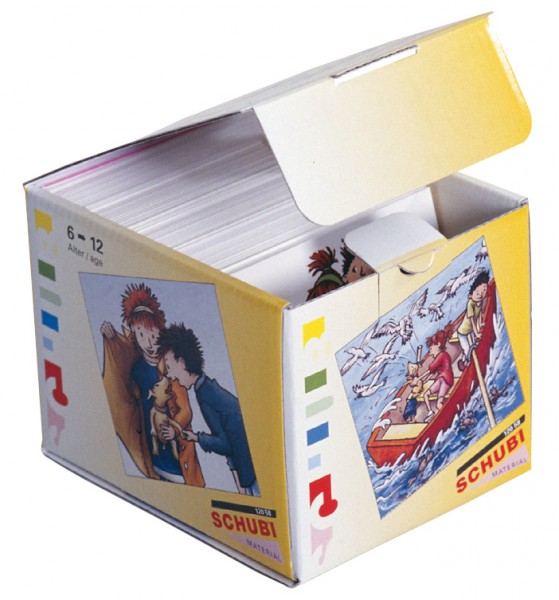 Inhalt: 24 Bildergeschichten mit je 6 Karten 9 x 9 cm, insgesamt 144 Bildkarten. Mit Anleitung, in Kartonbox.