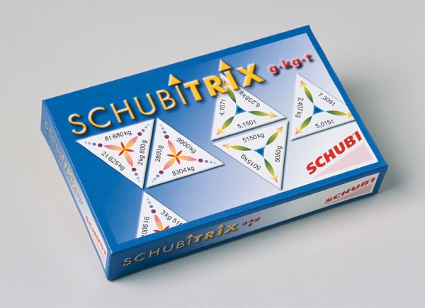 SCHUBITRIX wird nach den bekannten Dominoregeln gespielt. Die bunt gestalteten dreieckigen Spielkarten werden so aneinander gelegt, dass Rechnungen und Ergebnisse an den Seiten zusammenpassen. Die Figur. die entsteht, ermöglicht eine rasche Selbstkontrolle.