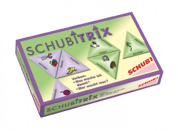 Wenn die dreieckigen Spielkarten so zusammengefügt werden, dass die beiden Wörter der aneinander liegenden Seiten zusammen passen, entsteht eine symmetrische Lösungsfigur. Mit SCHUBITRIX Deutsch erweitern die Kinder ihren Wortschatz und gewinnen mehr Sicherheit im Ausdruck - das kommt ihnen bei vielen Aufgaben im Sprachbereich zugute, zum Beispiel beim Formulieren eigener Texte.