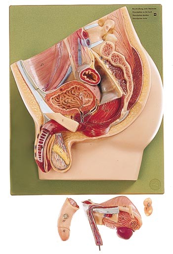 natürliche Größe, aus SOMSO-Plast. Mastdarm, Harnblase mit Prostata und Ductus deferens, sowie die äußeren Geschlechtsorgane vollplastisch modelliert und abnehmbar. Insgesamt 4teilig. Auf Grundplatte.