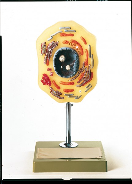 Vergrößerung 10000fach, aus SOMSOPlast. Nach Studiendirektor Christian Groß. Das Modell beschränkt sich auf die allgemein wichtigen Strukturen einer tierischen Zelle. Kern, endoplasmatisches Reticulum, Mitochondrien, Ribosomen, Golgi-Apparat und Zentriolen veranschaulichen das Kompartimentierungsprinzip dieser kleinsten tierischen Lebenseinheit. Anwendungsbereich: einfache Zellbetrachtungen. Unzerlegbar, auf Stativ mit Sockel und Beschreibung. Höhe 37 cm (Modell 22 cm), Breite 18 cm, Tiefe 18 cm, Gewicht 1 kg