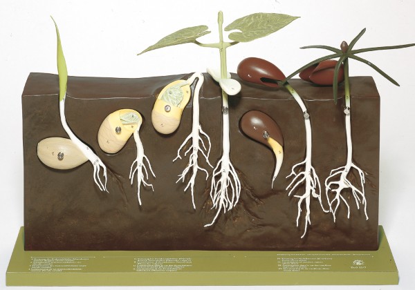 Eine vergleichende Zusammenstellung der Keimungen von Roggen (10fach vergrößert), Bohne (5fach vergrößert) und Fichte (20fach vergrößert). Aus SOMSOPlast. Nach Prof. Dr. W. Jung und Prof. Dr. W. Weber. Das Modell zeigt in anschaulicher Weise, daß 1. das Roggenkorn (Secale cereale) eine grüne Spitze aus dem Boden hervortreibt (Spitzkeimer - monocotyle Pflanze), 2. bei der Bohne (Phaseolus vulgaris) zuerst die beiden Keimblätter erscheinen (Blattkeimer - dicotyle Pflanze) und 3. die Keimpflanze der Fichte (Picea excelsa) aus der Erde hervorkommt, zuerst die Samenhülle abwirft und ihre Keimblättchen dann sternförmig ausbreitet. In 8 Teile zerlegbar. Auf Sockel mit Beschreibung. Höhe 37 cm, Breite 54 cm, Tiefe 14 cm, Gewicht 3,7 kg