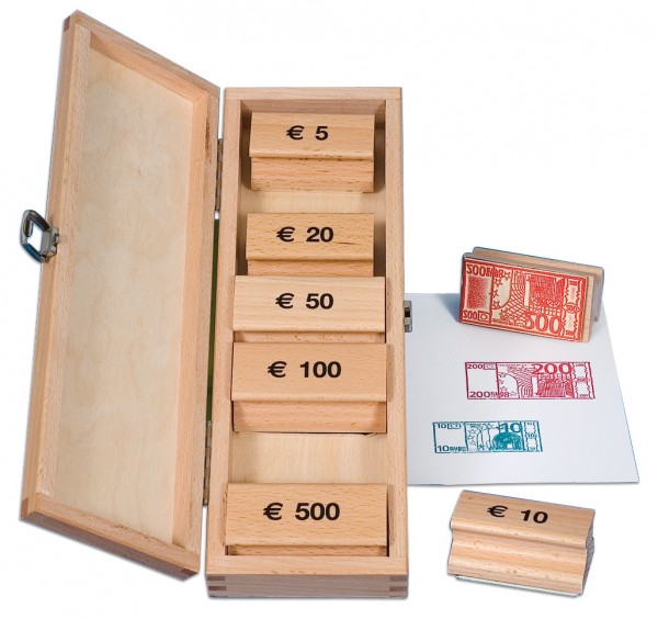 Euro-Geldscheinstempel Holzkiste mit Deckel (Innenmaß 300 x 86 x 42mm). 7 Holzstempel... mehr