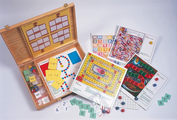 - 20 Spielpläne, 8 Normalwürfel, 8 Zehnerwürfel, Spielsteine (Setzer), über 800 Spiel- u. Zahlenkärtchen, ausführliche Spielanleitung: