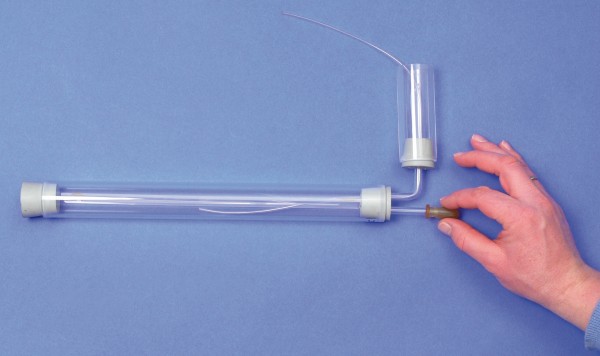 Jede Welle einer bestimmten Frequenz hat ihren maximalen Ausschlag an einer bestimmten Stelle der Grundmembran. Mit den Pipettenhütchen werden durch langsame Druckfolgen tiefe Töne, durch schnelle Folgen hohe Töne simuliert. Je nach Frequenz entstehen an den verschiedenen Stellen die maxim. Ausschläge. Die unterschiedl. breite Grundmembran wird durch die Trennlinie zwischen gefärbter Zuckerlösung und Benzin dargestellt. Lehrer-Info.