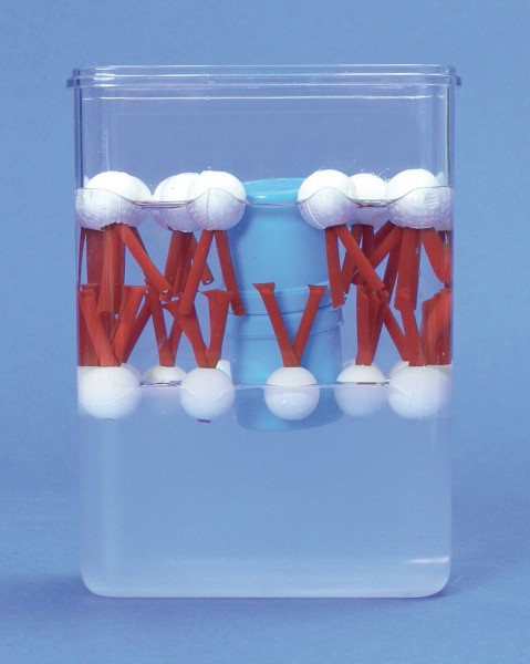 Die Biomembran ist ein Grundelement jeder lebenden Zelle. Das Modell in Flüssigkeit zeigt einen schematisierten Ausschnitt aus einer Biomembran. Der Aufbau wird deutlich. Sie können Ihren Schülern wesentliche Eigenschaften und Funktionen dieser Struktur gut erklären.