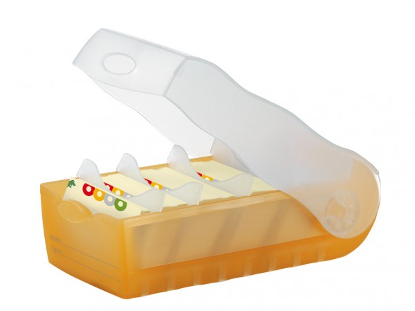 Maximal 900 Karten fasst die DIN A7-Größe. Jeweils sortiert und stabilisiert durch vier variable, automatisch arretierte Stützplatten. 100 linierte Karten sind jeweils inklusive. Und damit das Lernwunder immer zur Hand ist, passt CROCO A7 in die Seitentaschen üblicher Schulranzen.