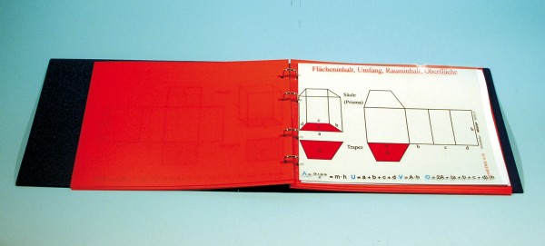 Bestehend aus: 15 zweifarbigen Folien mit separater Formelfolie. Auf der Folie sind Grundflächen, Volumen und Abwicklung mit Schnitten aufgedruckt. Sämtliche Folien sind in einer ansprechenden Kunststoff-Mappe abgeheftet und einzeln zu entnehmen.
