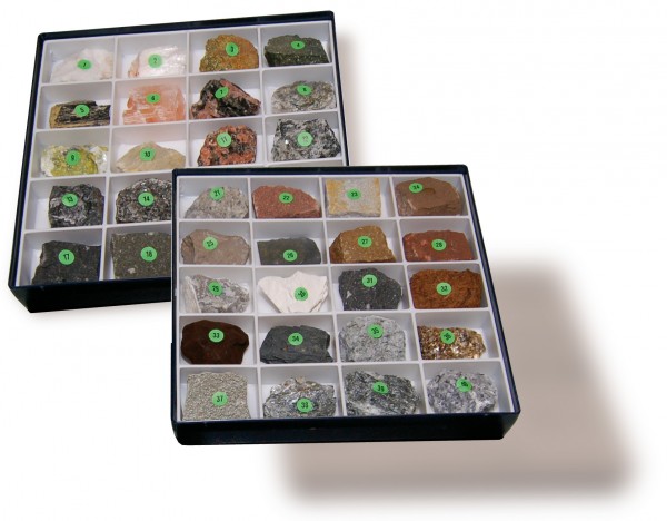 Die Kombination von 10 gesteinsbildenden Mineralien und 30 Gesteinen erläutert die wichtigsten Zusammenhänge der Petrographie und erlaubt dem Schüler ein selbständiges Einarbeiten in erste Gesteinsbestimmungsübungen. Eine preiswerte Sammlung zum Verteilen im Schülerkreis. Die Sammlung wird in 2 robusten gefächerten Kunststoffkästen geliefert. Die etwa 2x2 cm großen Stücke sind entsprechend einer erläuternden Inhaltsliste nummeriert.