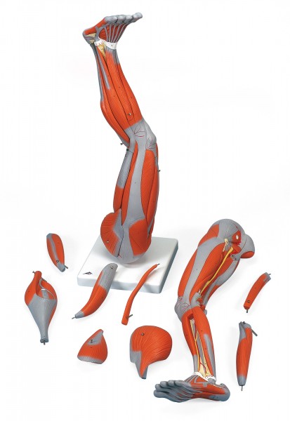 Das Modell zeigt die oberflächlichen und tieferliegenden Muskeln des linken Beins mit Fuß, von denen Sie acht abnehmen und detailliert studieren können. Muskeln, Sehnen, Gefäße, Nerven und Knochenpartien sind akkurat dargestellt und nummeriert. Lieferung auf abnehmbarem Sockel. 77x26x26 cm. 3,0 kg