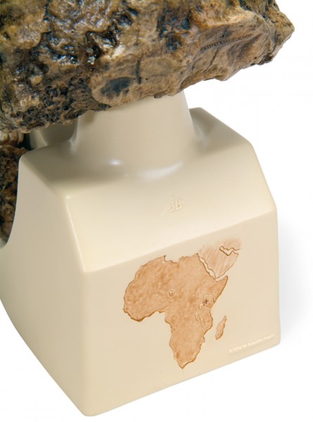 Australopithecus boisei (Zinjanthropus boisei). Fundgruppe: Australopithecus (Urmenschen). Fundzeit: 1959. Fundort: Oldoway Schlucht, Ostafrika. Alter: 1.750.000 Jahre. Originalgetreue Abformung eines echten Schädels. Inklusive kartographischer Darstellung des Fundortes auf der Sockelrückseite