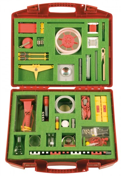 Ballonventil, -Batterien mit Halter, -Bechergläser, -Erlenmeyerkolben, -Federwaagen, -Gewichte, -Glaskugeln, -Glasrohre, -Glühlampen, -Gummiringe, -Gummistopfen, -Hebel, -Hebelschalter, -Heizdraht, -Klammern, -Kompassnadel, -Kupferdraht, -Lampe, -Lampenfassung, -Linse, -Luftballon, -Magnet, -Mess- u. Stativstab, -Pipette, -Reagenzgläser, -Reagenzglashalter, -Rollen, -Rückstoßwagen, -Schallboxen, -Schaufelrad, -Schirme, -Schlauch, -Schnur, -Spiritusbrenner, -Spritze, -Stimmgabel, -Streichhölzer, -Teelichte, -Thermometer, -Trichter, -Verbindungskabel, -Waage, -Windrose