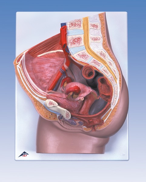 Das Medianschnitt-Modell zeigt alle wichtigen Strukturen des weiblichen Beckens. Zum Studium der inneren Strukturen ist eine Hälfte der Genitalorgane abnehmbar. Auf Grundbrett mit Wandbestfestigungsmöglichkeit. 41 x 31 x 20 cm.