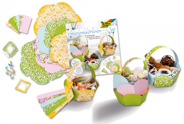 Set für 6 Henkelkörbchen ø 11,5 cm mit Anhängern und 3 Körbchen ø 14,5 cm aus beidseitig bedrucktem Fotokarton. Das Stecksystem funktioniert im Handumdrehen - ganz ohne Kleben.