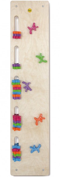 Im Querformat eignet sich die Geisterwand besonders für die Kleinsten. Bis zu 5 Kinder können nebeneinander an den Geistern drehen oder kleine Geisterstapel bauen. Die Aufbewahrungsschlitze können hier gleichzeitig als Haltegriffe genutzt werden. Die Zuordnung der 5 Geisterfarben zu den Aufbewahrungsschlitzen lädt hervorragend zum Aufräumen ein.