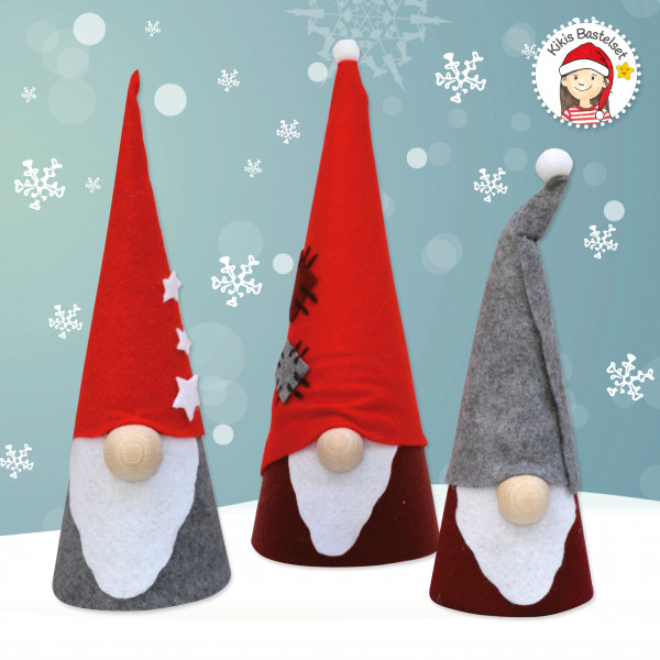 Stolze 25 und 30 cm messen diese Wichtel. Pro Set sind 2 kleine und ein großer Wichtel enthalten. jede Mütze kann nach eigenen Wünschen verziert werden.