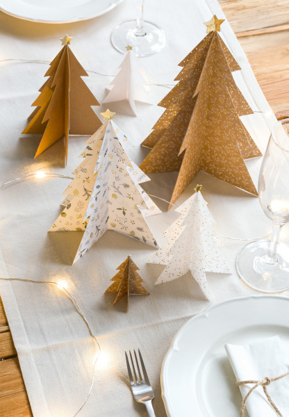 Das Bastelset für 12 Tännchen in unterschiedlichen Größen aus bedrucktem Kraftkarton und Transparentpapier