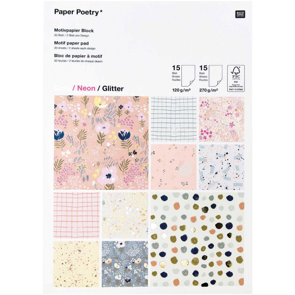 Pinselstriche, Tupfer, florale Designs – der Trend geht zum Handgemachten! Die Leichtigkeit des Selbstgemachten und der Charme des nicht Perfekten treten in den Vordergrund. Die Themenwelt „Crafted Nature“ greift diesen Trend mit aquarellierten, natürlichen Designs auf. Durch Farbspritzer, -tupfer und sichtbare Pinselstriche entstehen unbekümmerte, lebendige und zeitgemäße Muster. Die individuellen, modernen Designs der Produkte dieser Themenwelt eignen sich für vielseitige Bastelprojekte und DIYs. Viele der Produkte sind mit Neonfarben, goldener Hot Foil und hochwertigen Glitzerakzenten, die für ein tolles Funkeln sorgen, veredelt. Der passende Motivpapierblock enthält 30 Blätter mit 15 verschiedenen Designs auf zwei verschiedenen Papierstärken.