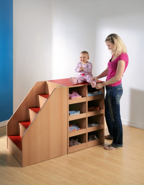 Durch die Höhe von 90cm erleichtert es das Anziehen der Kinder. Korpus im Buche Dekor, Oberfläche mit Linoleum belegt (bitte Farbe angeben). Mit 8 Fächern für Kleidung.