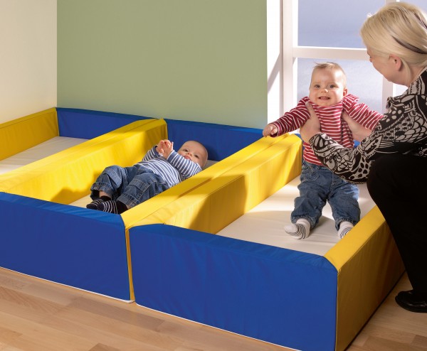 Die Bettchen können Sie bei Bedarf einfach unbegrenzt aufeinander stapeln. Da der Innenkern aus leichtem Schaumstoff besteht, können Sie das ganz alleine. Der Boden ist mit Anti-Rutsch-Gewebe bezogen - für einen extra sicheren Stand. Farbe: blau-gelb. Maße B/H/L: 63 x 20 x 113 cm.