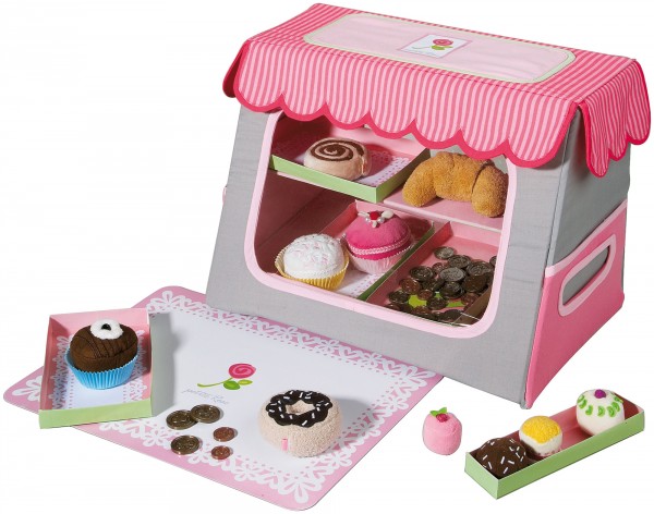 Inhalt: 1 Kuchenstand, 3 Muffins, 1 Donut, 1 Hörnchen, 1 Gebäckschnecke, 4 Pralinen, 5 Auslageboxen, 1 Tablett, 1 Satz Münzen.