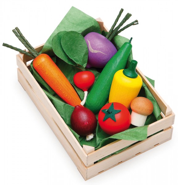 In der Stiege befindet sich folgendes, aus farbig lackiertem Holz hergestelltes Gemüse: 1 Tomate, 1 Möhre, 1 Gurke, 1 Champignon, 1 gelber Paprika, 1 Zwiebel, 1 Kohlrabi, 1 Radieschen