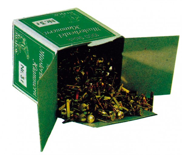 Mit Rundkopf und abgerundeten Schenkeln. Diese Klammern sind vermessingt und haben eine Länge von 17 mm. Die Lieferung erfolgt im Karton mit 1000 Stück.