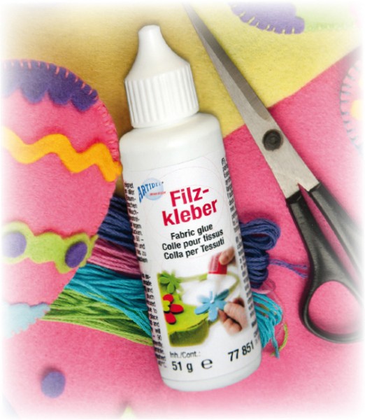 Für das Verkleben von Filz mit Filz oder anderen Materialien, bevorzugt Textilien, eignet sich dieser dickflüssige Spezialkleber besonders gut. Die Textilien werden mit der Klebeflüssigkeit benetzt, aber nicht durchnässt. Das bewirkt ein schnelles, sicheres Zusammenheften, was innerhalb von 60-90 Minuten zu einer festen, nicht wieder lösbaren Verklebung führt. Für das Zusammen-, teilweise auch Aufeinanderkleben eignen sich fast alle Textilien, die aus natürlichen und synthetischen Garnen bestehen, z.B. Filzapplikationen, Knieschoner, Taschenaufsätze etc.