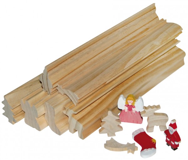 Figuren zum Dekorieren und Basteln in gewünschter Sträke absägen. Aufgeklebt verschönern sie Grußkarten, Blumentöpfe... Auch zum Basteln von Schlüsselanhängern geeignet. Inhalt 6 Stangen (pro Stange ca. 30-40 Figuren), Material neuseeländische Kiefer. Maße pro Stange ca. 6x5x30 cm.