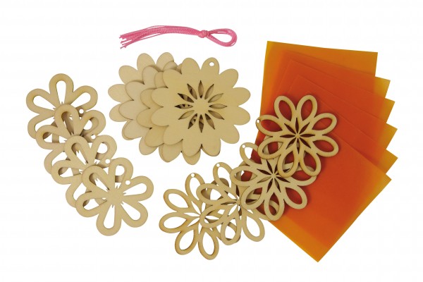 Inhalt: 12 Holzanhänger „Blümchen“ mit 6 Blättern orangem Transparentpapier und pinker Bändchen; ø größtes Blümchen ca. 7 cm; Material: Sperrholz, Papier