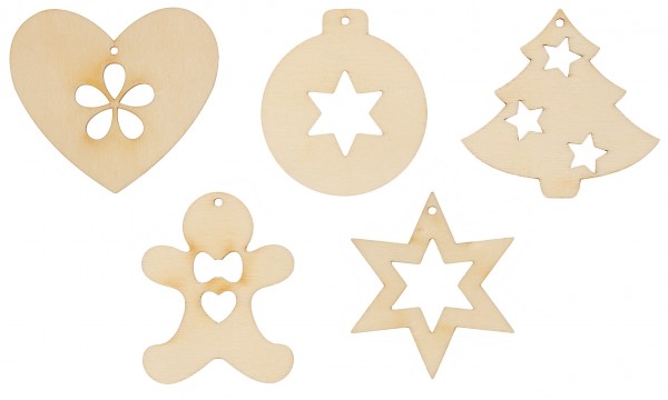 Inhalt: 15 Holzanhänger „Klein“; ø Stern 5 cm; 5 versch.Motive (Jedes Motiv ist 3x im Set enthalten) Material: Sperrholz.