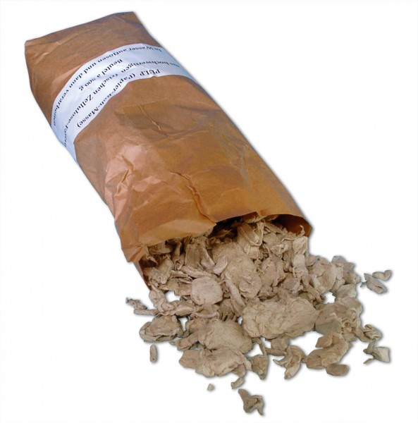 Herstellen der Papiermasse: Altpapier oder Zellstoff wird in kleine Stücke zerrissen und in ausreichend viel Wasser eingeweicht.