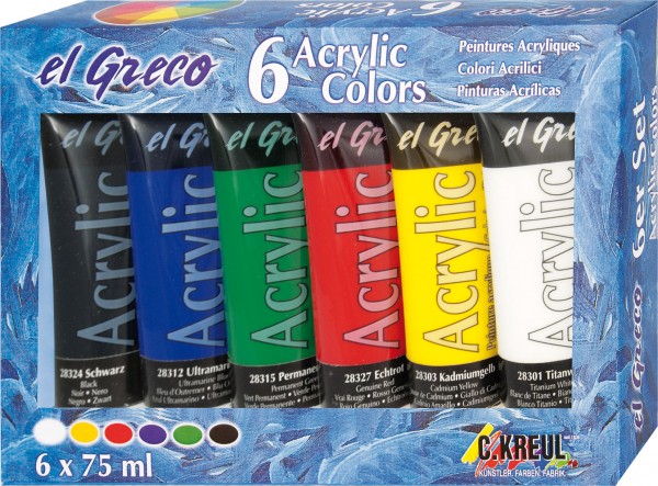 6 Acrylfarben in 75 ml Tuben (Titanweiß, Kadmiumgelb, Echtrot, Ultramarinblau, Permanentgrün, Schwarz)