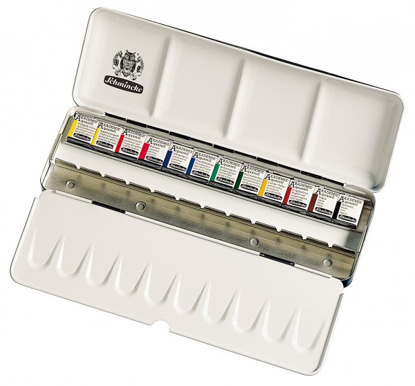 AKADEMIE® Aquarell enthält beste Pigmente in hoher Konzentration und Reinheit. Im Sortiment sind 14 Ein-Pigment-Farbtöne enthalten, die ideal zum Ermischen von Farben sind. Dank einer optimalen Bindemittelkombination ist der Farbverlauf gut kontrollierbar und die Farben lassen sich auch nach der Antrocknung auf der Palette ohne Qualitätsverlust wieder verwenden. Es handelt sich hierbei um stabile Taschenblechkästen, die mit einer Deckelpalette sowie einer ausklappbaren Palette versehen sind.
