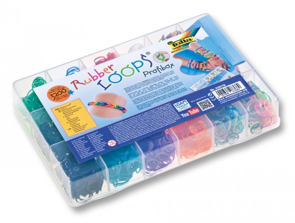 Die RubberLoops Profibox umfasst 3200 Loops, 10 Charms, Werkzeuge, 78 Verbindungsstücke und eine Anleitung in einer ansprechenden und stabilen Plastikbox. über 3200 Teile