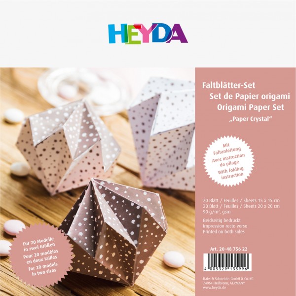 Faltblätter-Set ”Crystal” , 90g/m², 40 Blatt in zwei Größen (15x15cm & 20x20cm), beidseitig bedruckt, mit leichtem Seidenschimmer, inkl. Faltanleitung, für 20 Kristalle in 2 Größen.