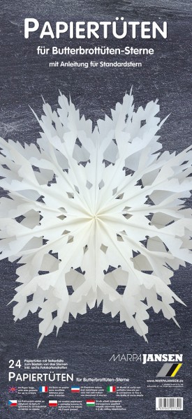 Bastelset ”Papiertüten für Butterbrottüten-Sterne” 24 Papiertüten mit Seitenfalte zum Basteln von bis zu drei Sternen, 6 Fotokarton-Streifen zum Aufhängen, zum Basteln von Butterbrottüten-Sternen, mit Anleitung.