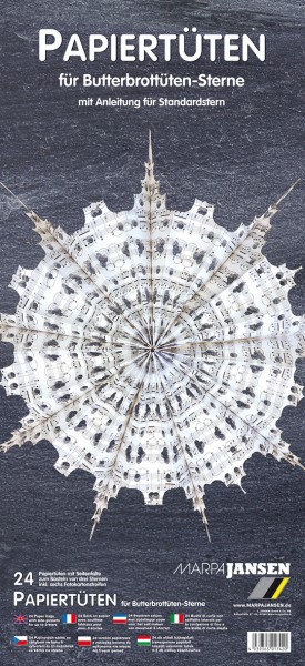 Bastelset ”Papiertüten für Butterbrottüten-Sterne” 24 Papiertüten mit Seitenfalte zum Basteln von bis zu drei Sternen, 6 Fotokarton-Streifen zum Aufhängen, zum Basteln von Butterbrottüten-Sternen, mit Anleitung.