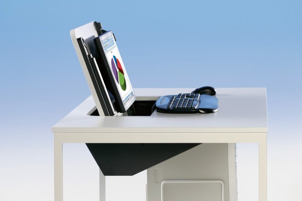 Wie durch Zauberhand verschwinden Tastatur, Maus und Monitor im Tisch, wenn sie nicht benötigt werden und eine ebene Arbeitsfläche entsteht.