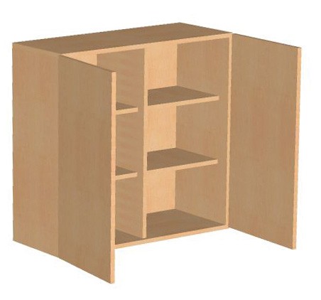 Aufsatzschrank mit 4 halben Böden und Mittelwand. Der Korpus und die Türen sind aus 19mm E1 Feinspanplatten. Alle Kanten sind geschlossen und alle sichtbaren Kanten mit 2 mm heißverklebten ABS-Umleimern ausgeführt.