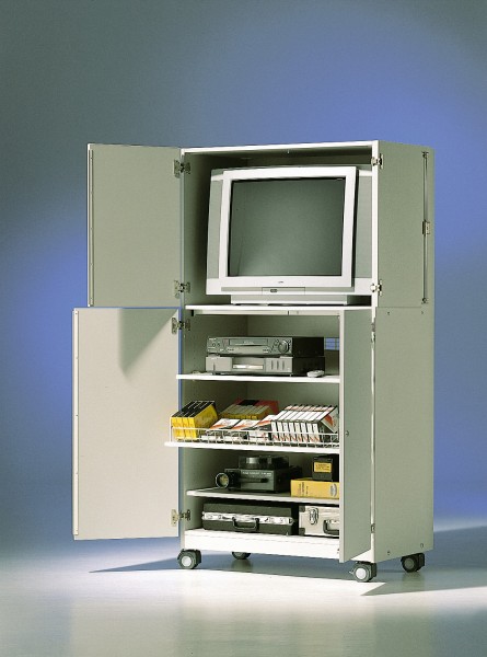 Stabiler TV-Wagen mit 4 formschönen Rollen, davon 2 feststellbar. Das TV-Fach ist mit einem Stabilisator ausgerüstet. Je eine Lüftungsrosette befindet sich in Höhe des Monitors und des Videogerätes. Geteilte Türen, mit 270° Scharnieren, ermöglichen die separate öffnung des TV-Fachs. Ein Zylinderschloss sichert den Schrank gegen Unbefugte.