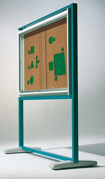 Modelle IV2 freistehend Glasschiebetüren aus Fensterglas Korpusmaße B/H/T: 150 x 100 x 12 cm Maße einschließlich Tragrahmen, B/H/T: 160 x 190 x 50 cm (Füße) Rückwand: Naturkork zum Anheften von Informationen mittels Push-Pins. Die freistehenden Modelle sind 150 cm breit und werden durch massive, kunststoffbeschichtete Stahltragrahmen gehalten, die felsenfest auf breiten Stahlfüßen stehen. Für die Rückwände stehen die Materialien Stahlemaille, grün bzw. weiß (Whiteboard) sowie Naturkork zur Wahl.