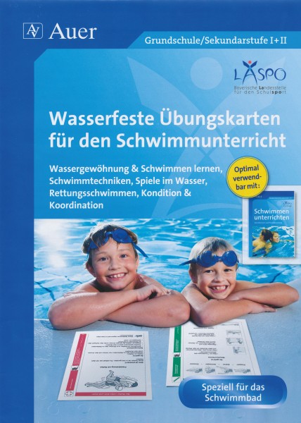 je 8 übungskarten (vorder-/rückseitig und zweifarbig bedruckt) zu den Themen Wassergewöhnung, Schwimmtechniken, Kondition & Koordination, Rettungsschwimmen und Spiele im Wasser sowie eine kurze Erläuterung zum Einsatz der übungskarten.