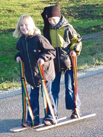 Hier werden die koordinativen Hand/Fuß-Fähigkeiten der übenden besonders auf die Probe gestellt. Die Hand-Fußschlaufe ist durch einen Schiebemechanismus ganz einfach verstellbar. Die Schlaufe kann so eingestellt werden, dass der Fuß auf dem Sommerski fixiert wird. Die Fuß-Handschlaufe dient zur Unterstützung des Bewegungsablaufes und zum Festhalten des übenden. Der übungsablauf ist somit einfacher. Wird die Schlaufe offen geführt, so muss zwischen Fuß und Brett immer über die Hand-Fußschlaufe ein Gegendruck erzeugt werden um den Kontakt zu halten. Der übende muss dies fortlaufend unter Einsatz der Hände aussteuern. Der koordinative Anspruch ist daher höher. Ausführung: äußerst stabiles Sperrholz, rutschfest, grün beschichtet, 10 cm breit, 21 mm stark, stabile Fußschlaufen in Regenbogenfarben auch für Erwachsene passend.