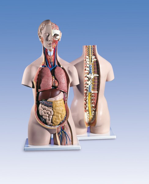 Dieser Torso mit einer vom Kleinhirn bis zum Steißbein geöffneten Nacken- und Rückenpartie ausgestattet. Wirbel, Bandscheiben, Rückenmark, Spinalnerven, Vertebralarterien und vieles mehr sind detailliert herausgearbeitet.