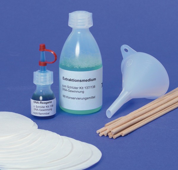 Inhalt des Kits: ca. 80 ml Extraktionsmedium, ca. 8 ml DNA-Reagenz, 5 Filter, 15 Holzstäbchen, 1 Trichter, ausführliche Versuchsanleitung. Die üblichen Laborgeräte, wie Reagenzgläser und Thermometer haben Sie in Ihrem eigenen Bestand. Außerdem brauchen Sie in Eigenbeschaffung eine Banane und Spiritus oder Isopropanol.